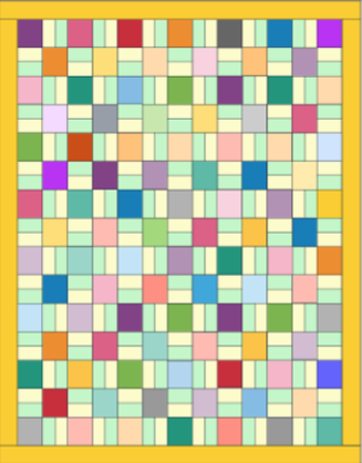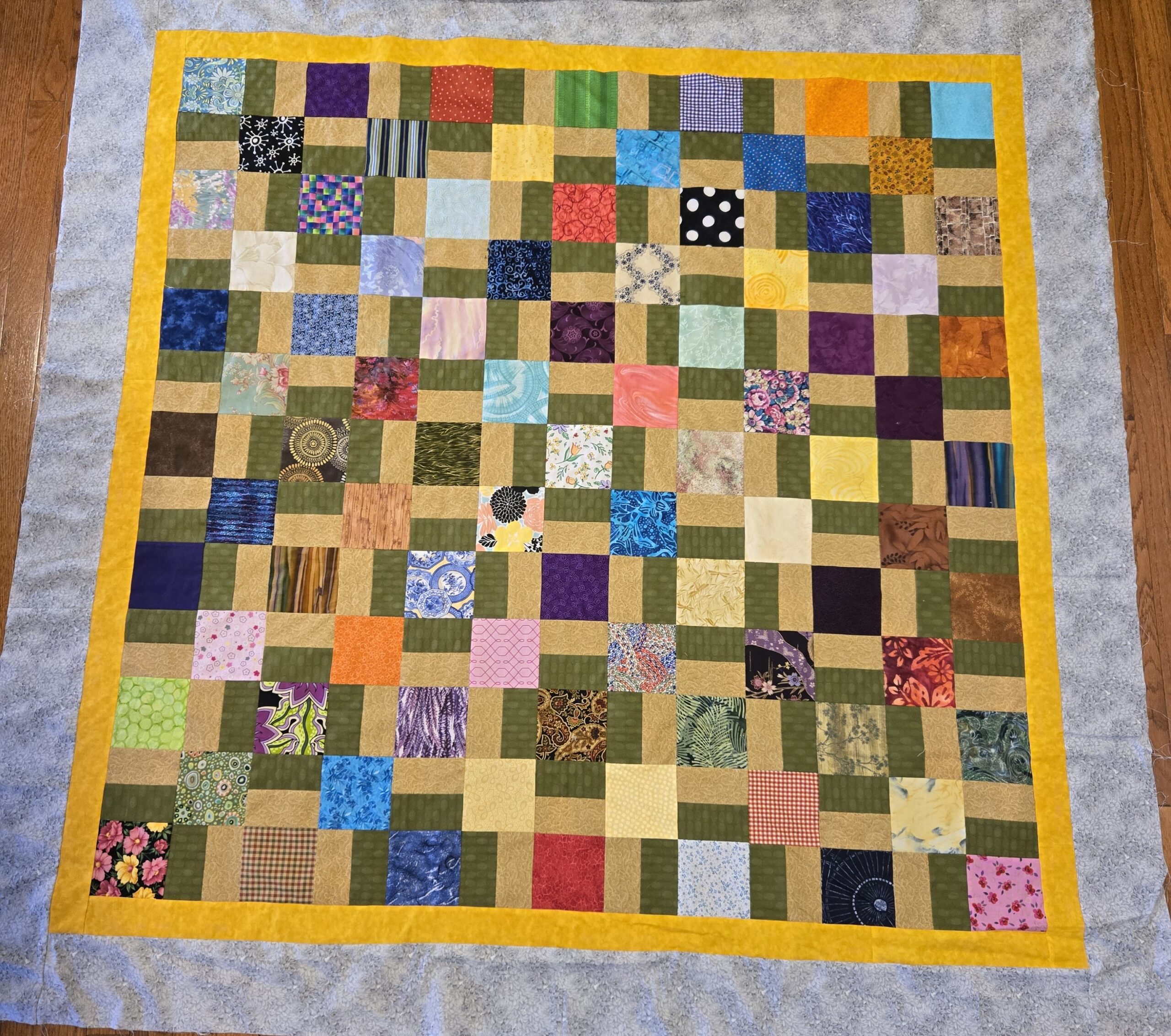 Each “scrappy” block is surrounded by a frame. The frames use two different fabrics. This is a fun quilt to make. It can easily be enlarged or made smaller.